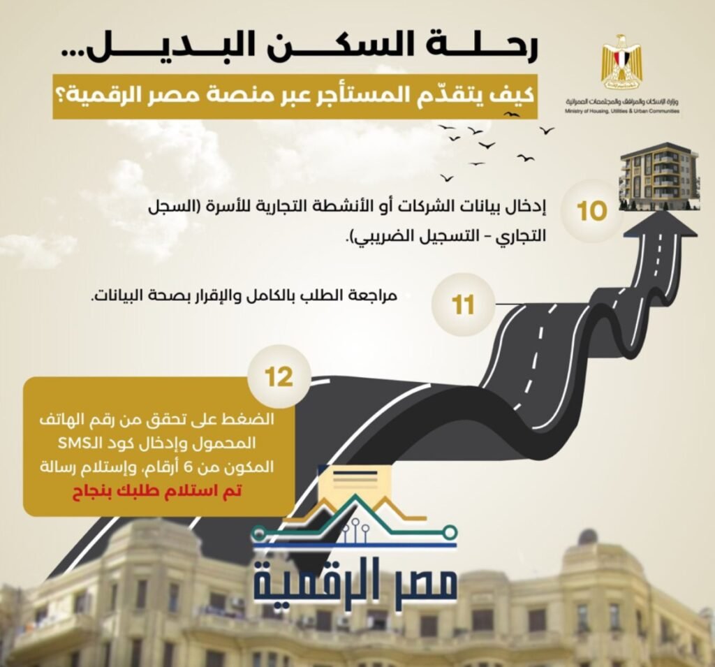 وتشمل خطوات التقديم من خلال منصة مصر الرقمية إنشاء حساب إلكتروني خاص أولًا ان لم يوجد مسبقاً، ثم اختيار خدمة “السكن البديل” من الصفحة الرئيسية لمنصة مصر الرقمية، ثم اختيار “استمارة تقديم على السكن البديل”، ثم الاطلاع على الشروط والأحكام الخاصة بالخدمة قبل الضغط على زر “أوافق على الشروط والأحكام”، ثم الضغط على زر “بدء الخدمة”، ثم استكمال جميع الخطوات الخاصة بهذه الخدمة، حيث يبدأ بتحديد العلاقة الإيجارية لمقدم الطلب سواء كان “المستأجر الأصلي” أو “زوج المستأجر الأصلي” أو “امتد إليه عقد الإيجار”، وإذا كان اختياره “امتد إليه عقد الإيجار” يجب عليه تحديد صلة القرابة.
