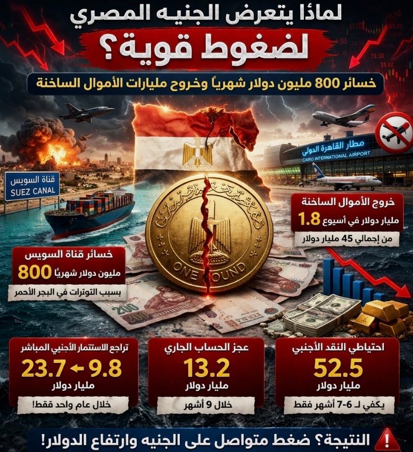 ومع استمرار خروج الأموال الساخنة و تراجع إيرادات قناة السويس ،و تأثر السياحة ، قوة الدولار عالميًا ، يبقى مستقبل الجنيه مرتبطًا بقدرة الاقتصاد على جذب استثمارات مستقرة وزيادة مصادر العملة الصعبة.
